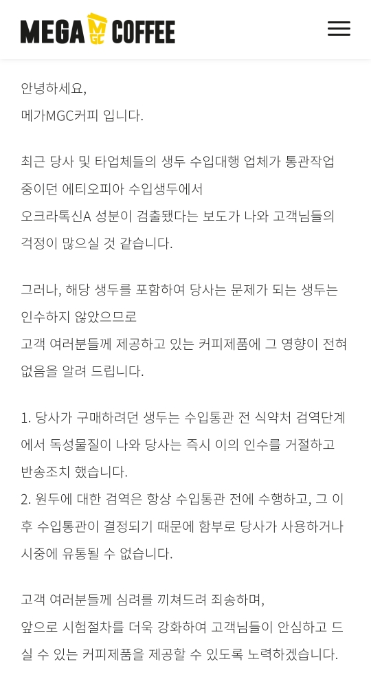 이것이 시중에 얼마나 유통되었고 소비자에게 어느정도 팔렸는지가 중요한 상황인데요. 메가커피측에 따르면 자신들이 운영하는 앤하우스에서 에티오피아산 원두를 수입해왔는데 이곳에서 오크라톡신A가 검출되었 다고 합니다.
